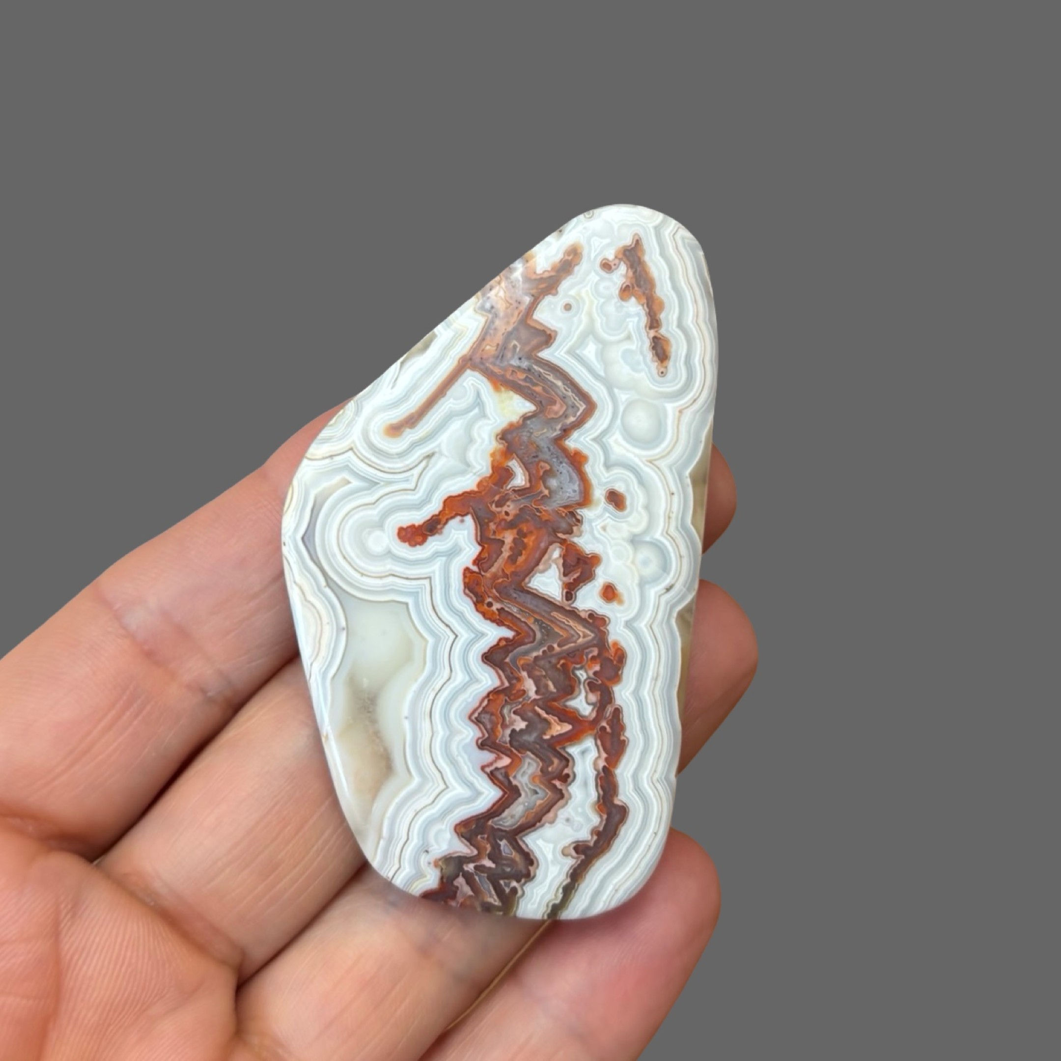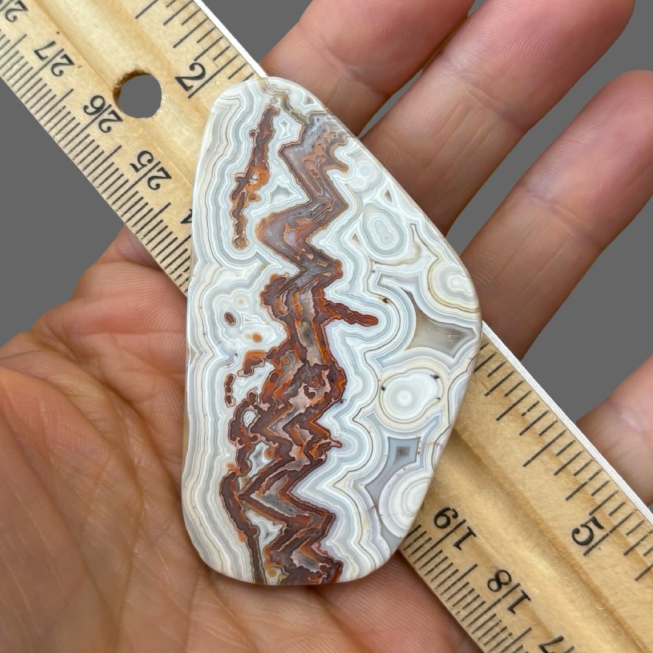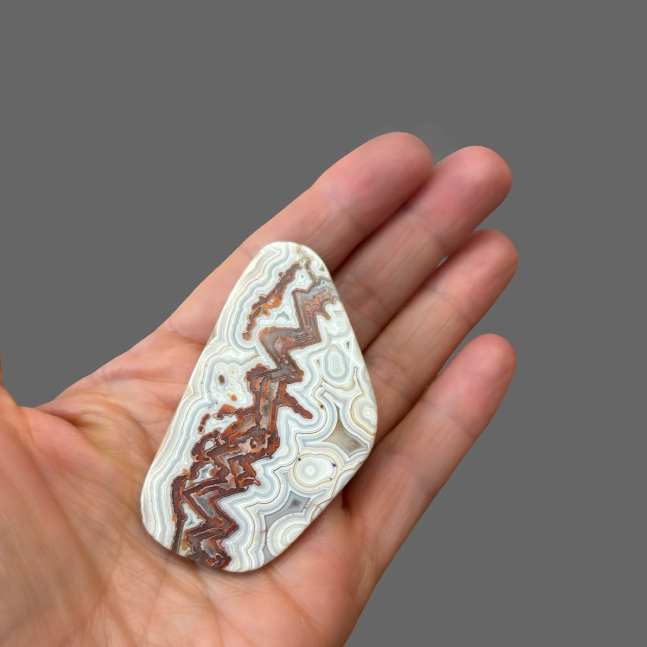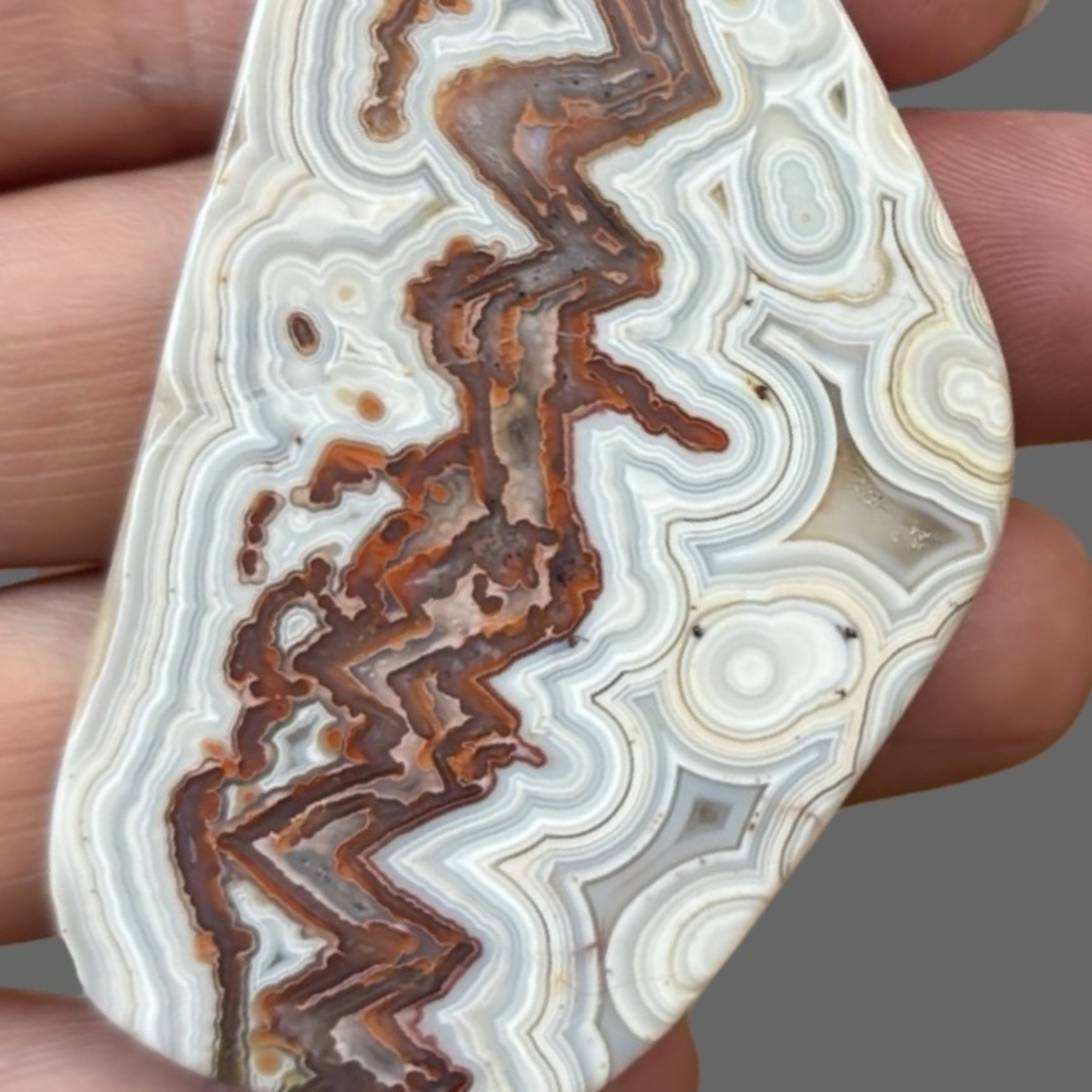Pretty, polished crazy lace agate slice/cabochon with a few fancy orbs from Chihuahua, Mexico.