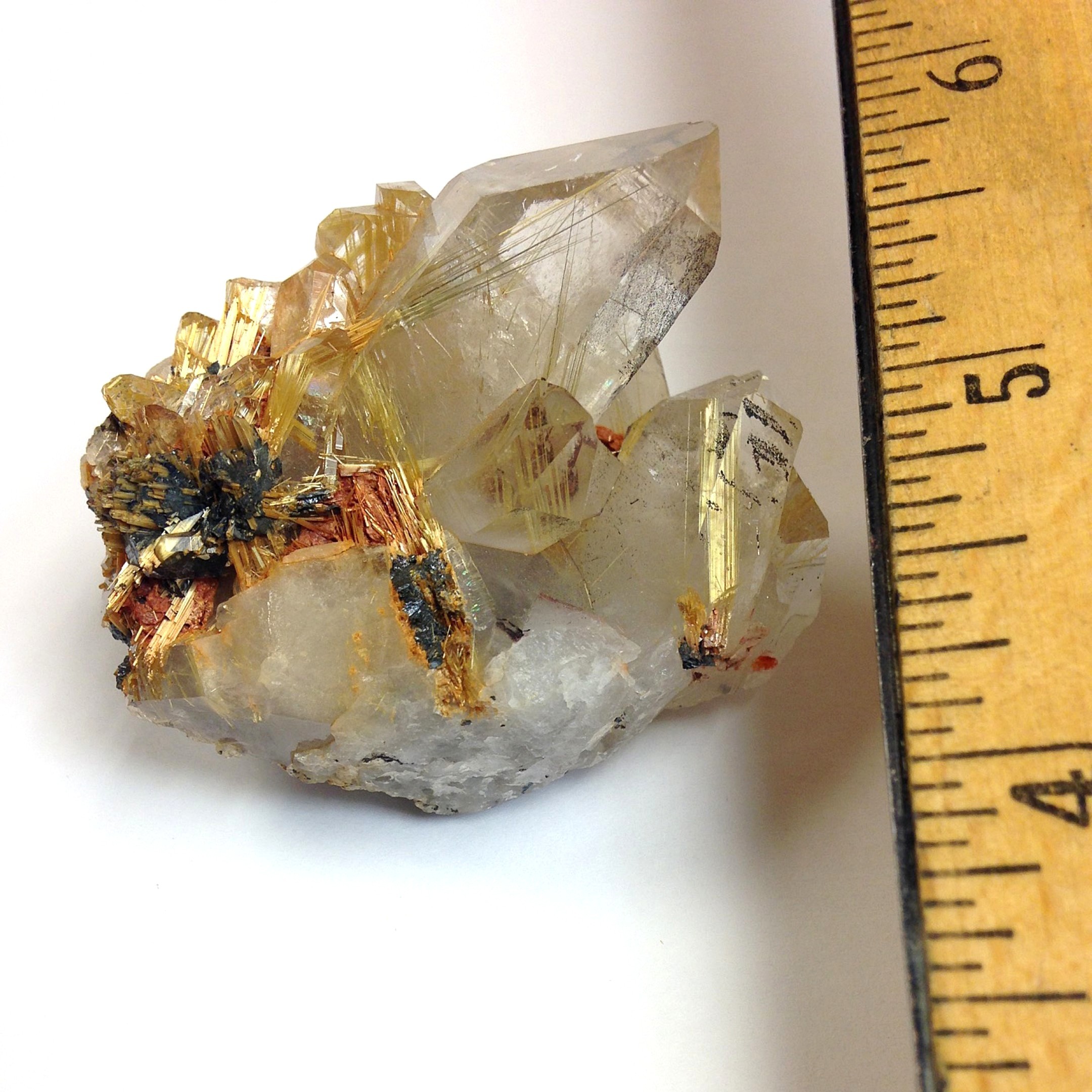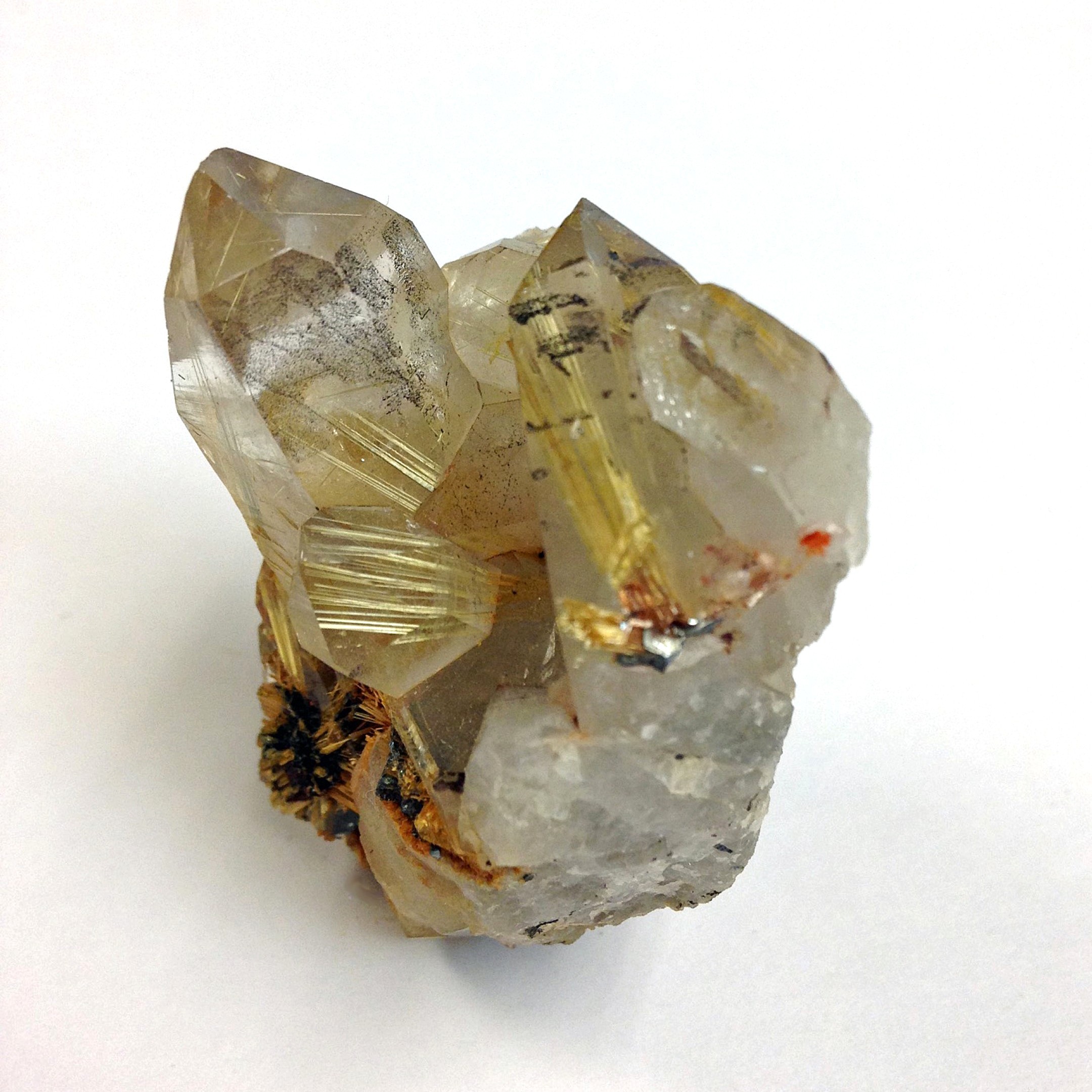 Small quartz cluster with exposed and internal rutile and hematite. From Novo Horizonte, Bahia, Brazil. A wonderful little collector’s piece!