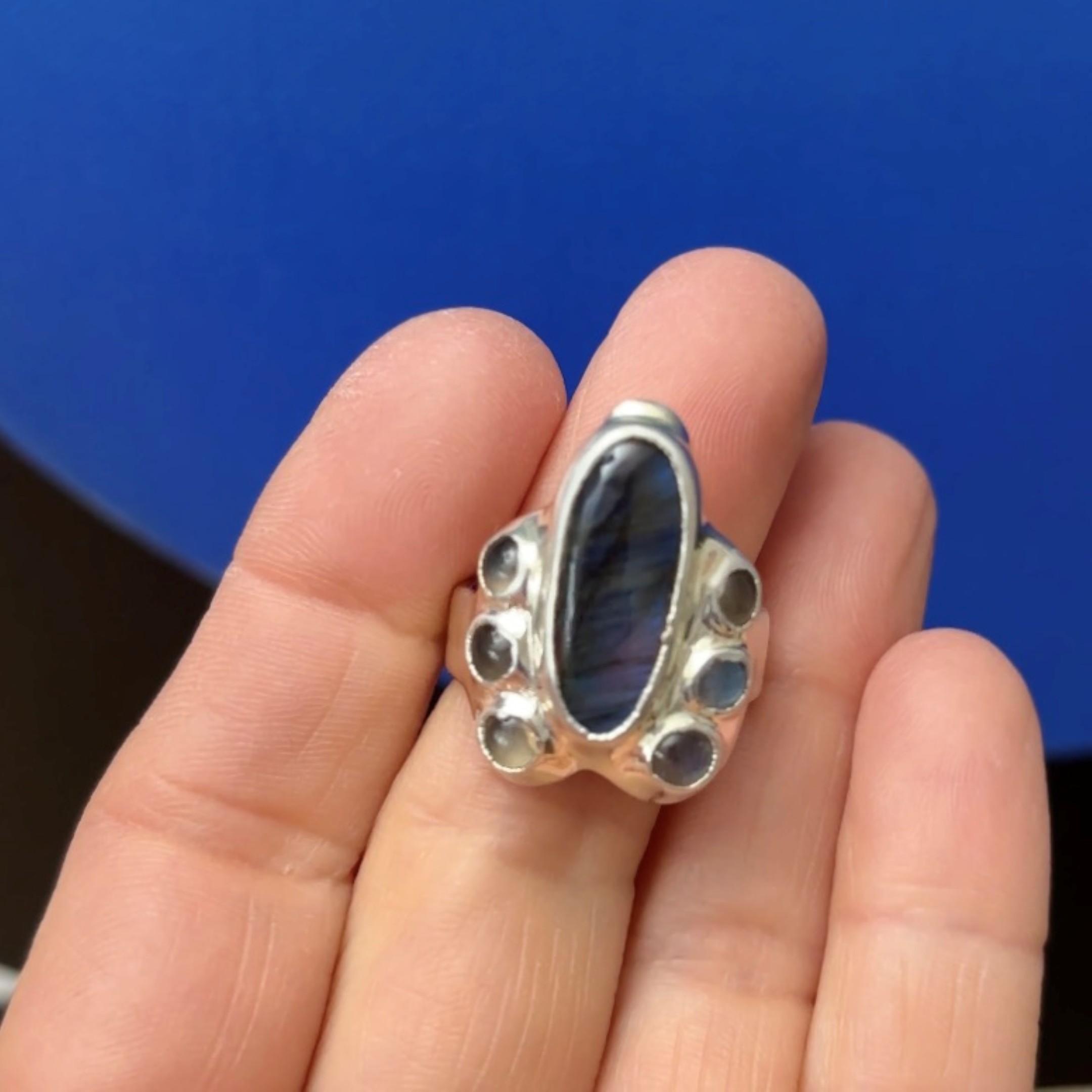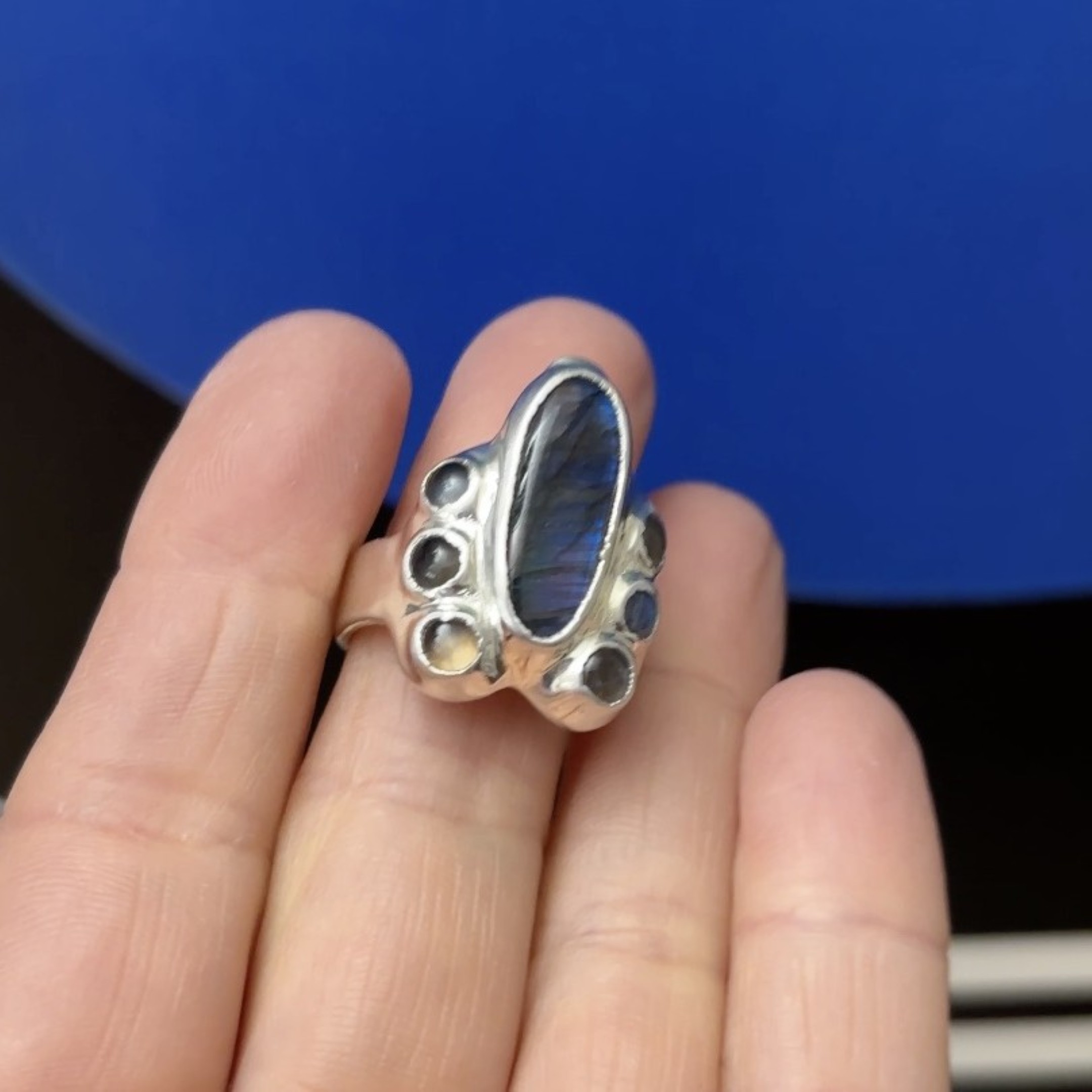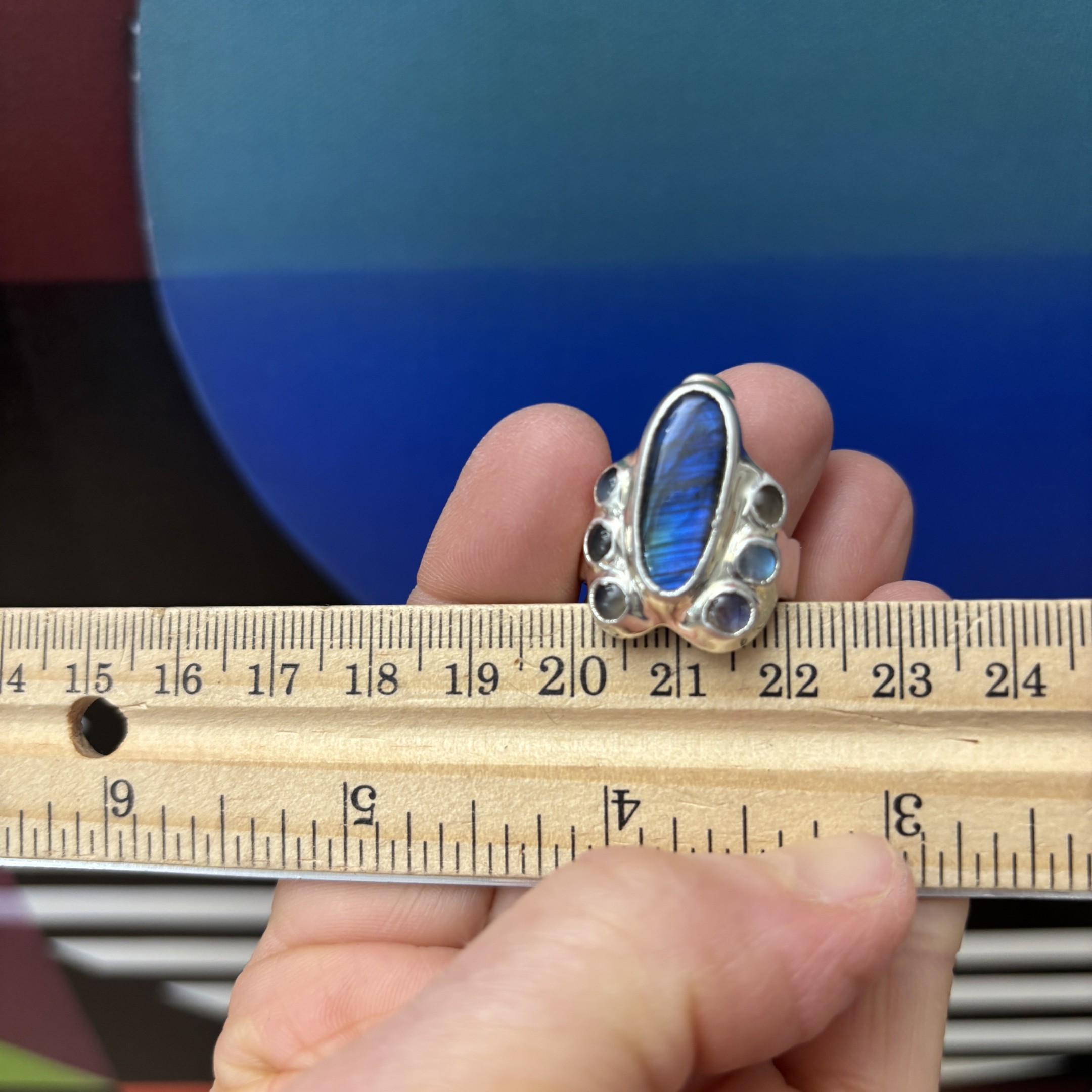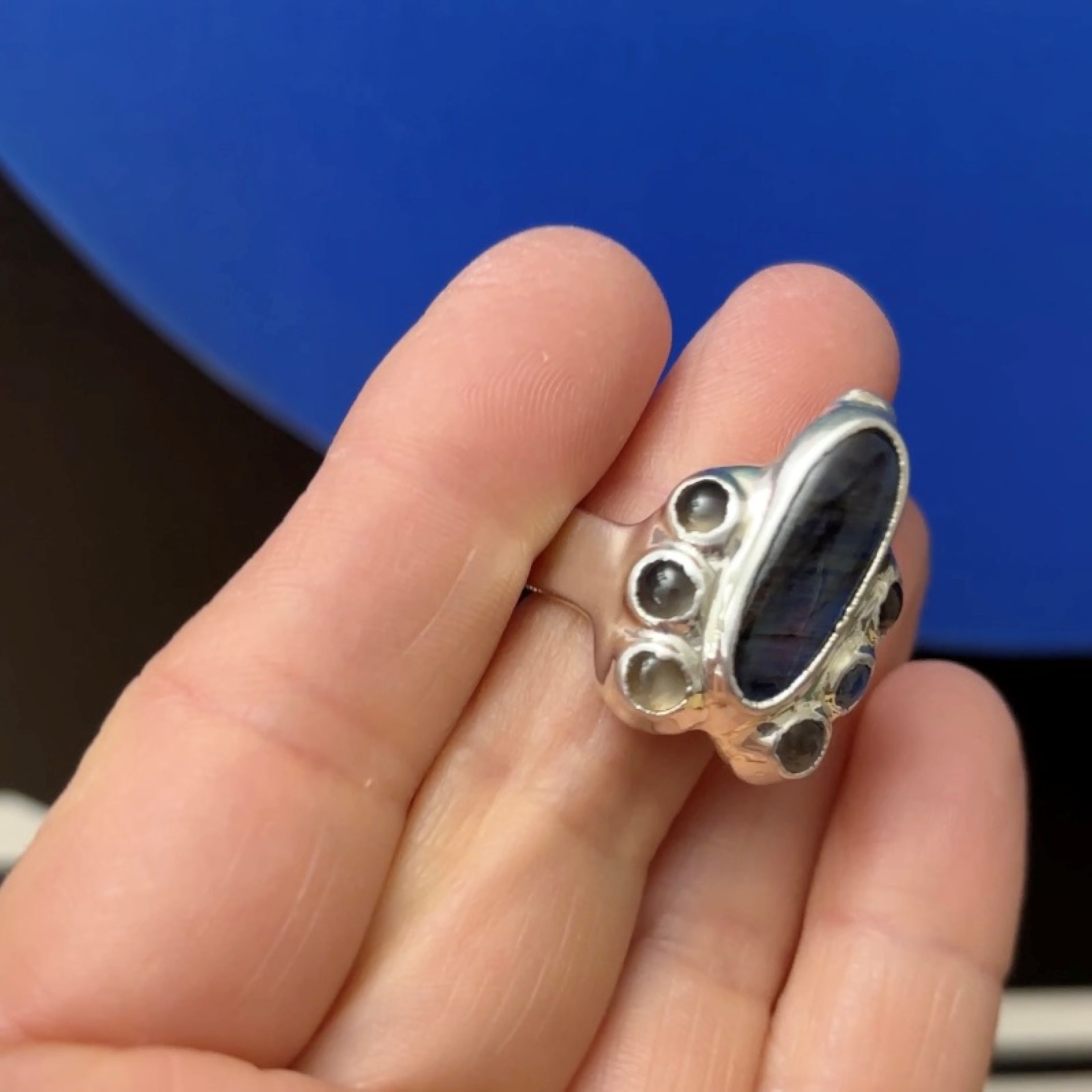 Lovely labradorite cabochons, set in fine silver. This one of a kind ring is designed by the amazing American artist and designer, Steven Ruse.