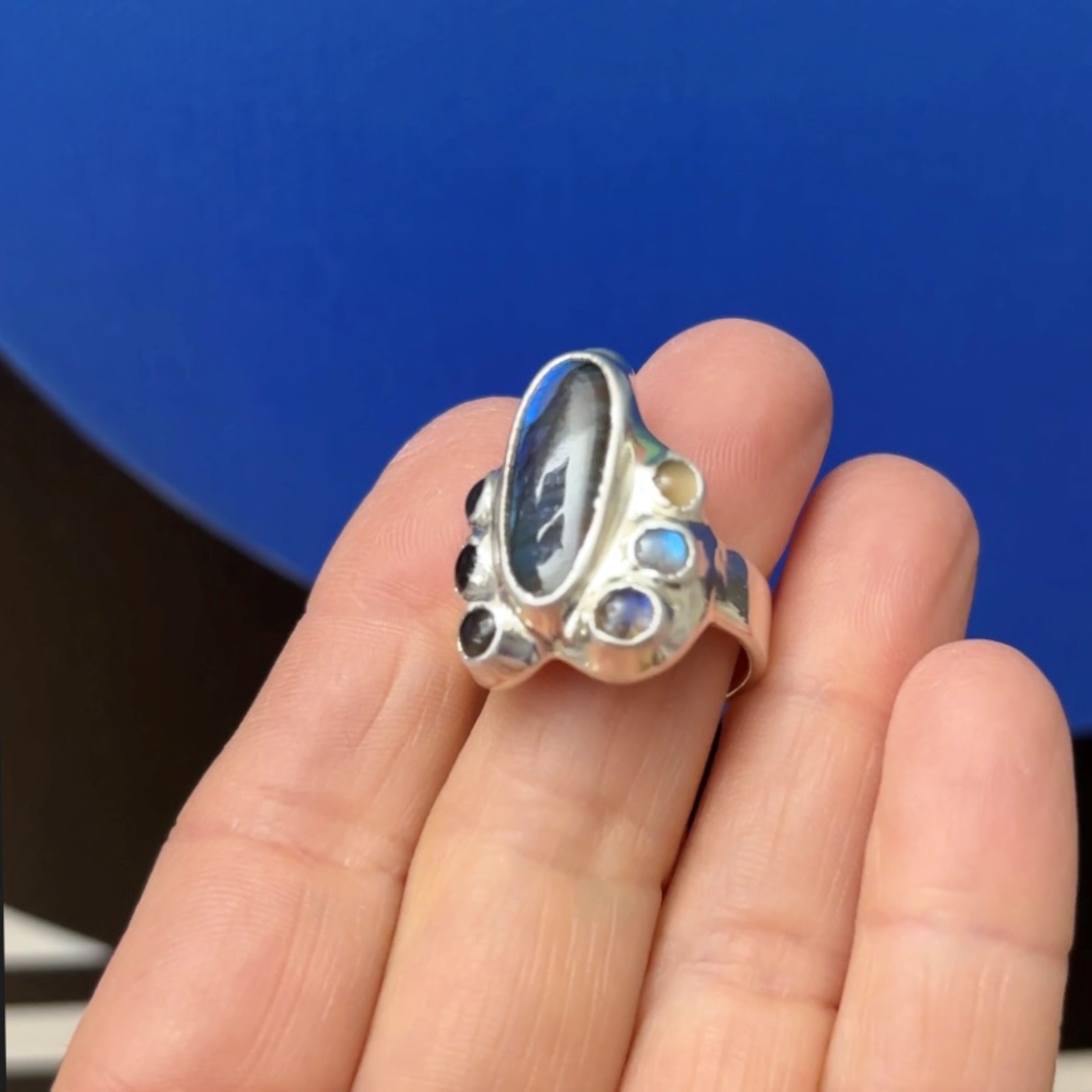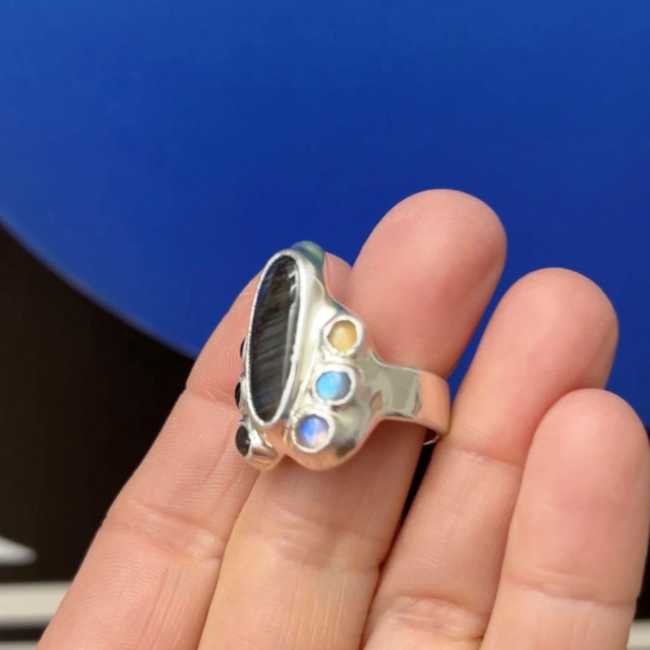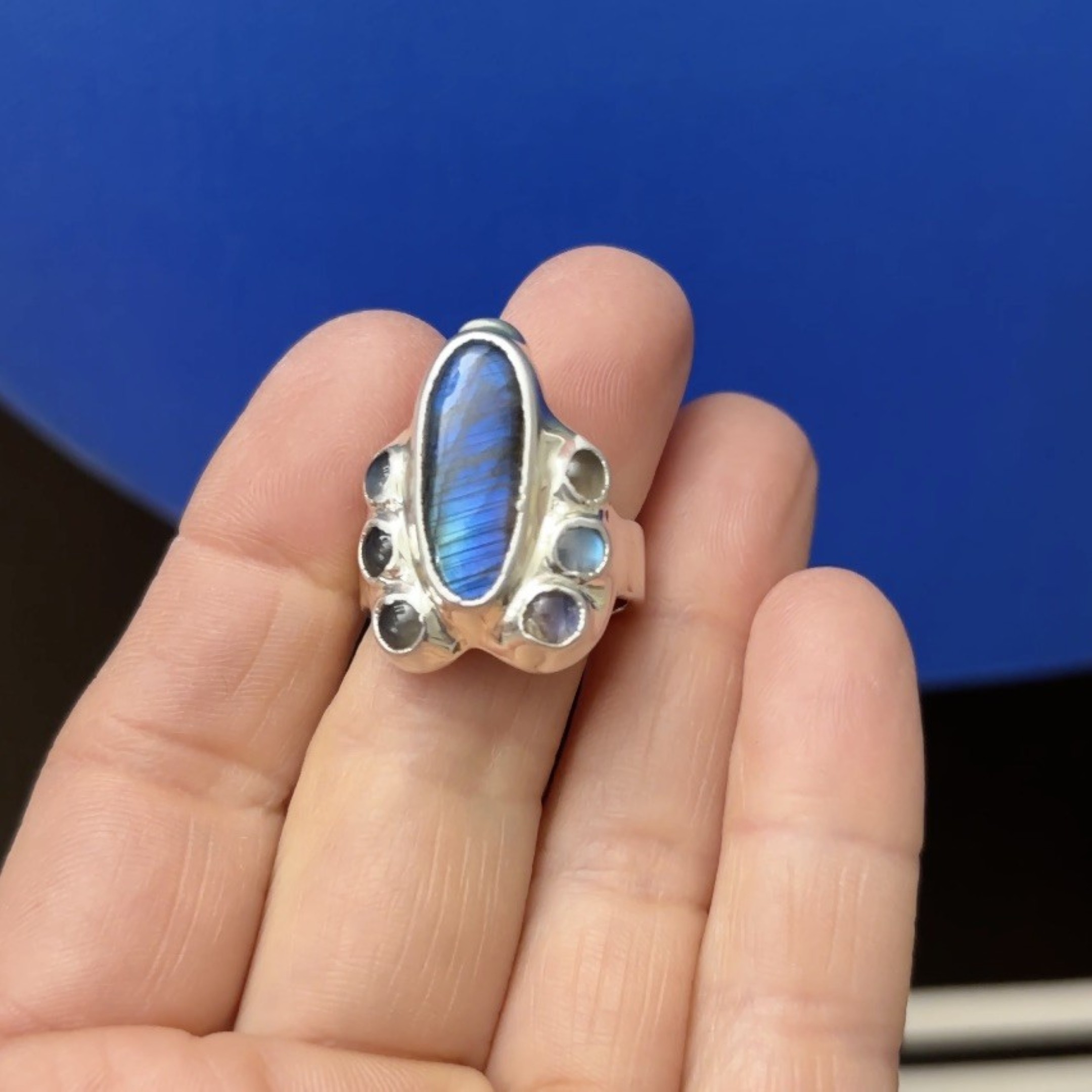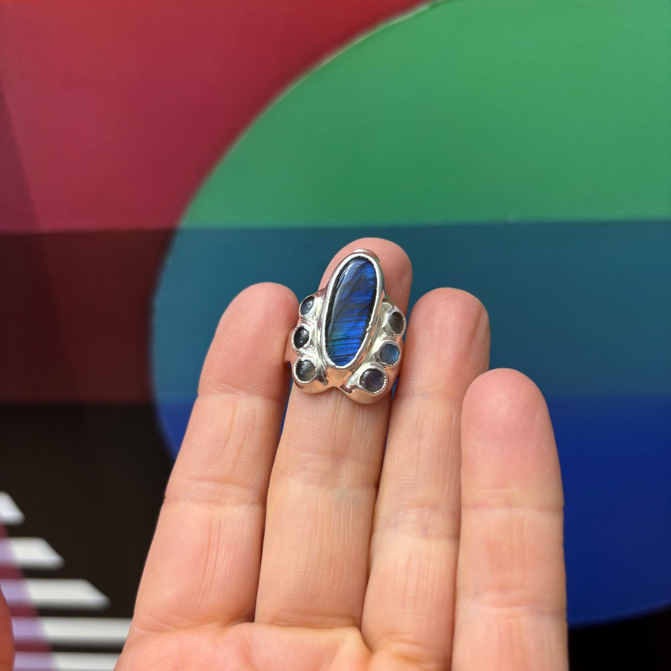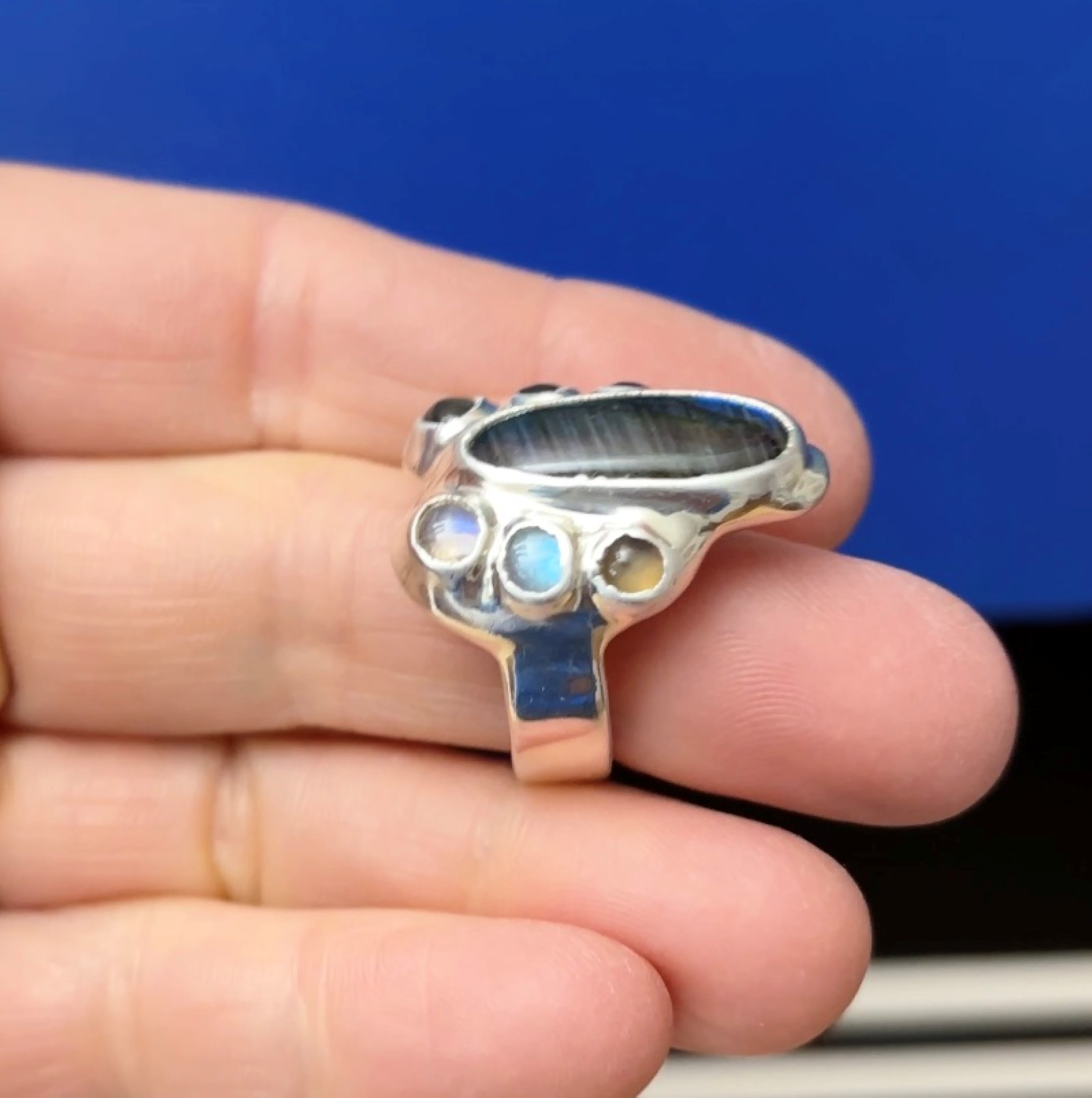 Lovely labradorite cabochons, set in fine silver. This one of a kind ring is designed by the amazing American artist and designer, Steven Ruse.